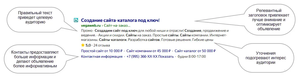 Создание привлекательных и эффективных объявлений является одним из важнейших шагов. Объявления формируются с учётом требований системы и пожеланий заказчиков. Они содержат: