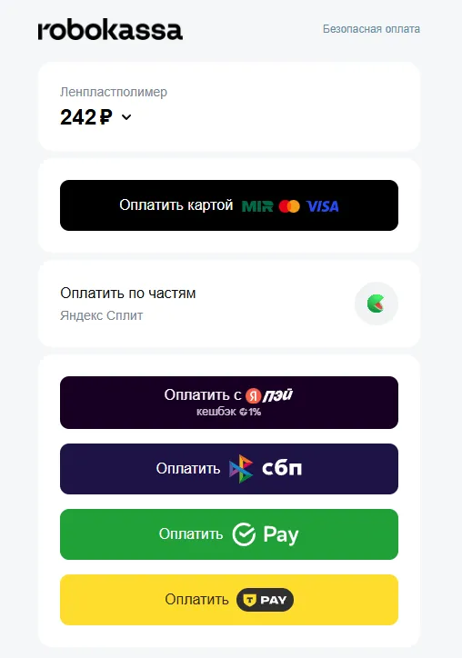 Сайт оборудован современными и надежными инструментами для безопасного совершения платежей. Есть возможность реализовывать оплату с помощью популярных платежных сервисов и банковских партнеров, гарантирующих удобство и защиту финансовых операций. Среди поддерживаемых методов оплаты: