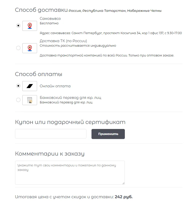 Сайт обладает гибкими возможностями настройки цен для различных категорий покупателей: постоянные клиенты могут воспользоваться специальными условиями и скидками, новые посетители получат привлекательные предложения, а оптовым покупателям предлагается особая цена за объём закупки. Помимо стандартных способов оплаты, покупатели могут совершать покупки с использованием подарочных сертификатов или специальных промокодов, что добавляет дополнительный комфорт и удобство в процессе шопинга. Точная настройка ценовой политики и возможность учитывать индивидуальные предпочтения клиентов способствуют повышению лояльности и удовлетворенности пользователей сервиса.